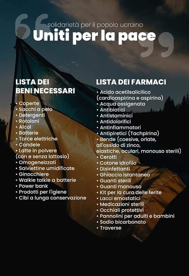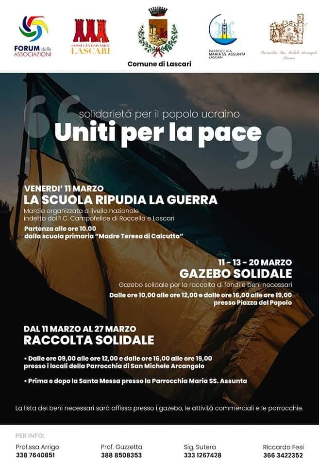 Pertanto, il FORUM delle Associazioni di Lascari, le parrocchie, la Consulta giovanile, l'Amministrazione Comunale e l'I.C di Campofelice di Roccella e Lascari, hanno organizzato diverse iniziative, come distinte nella locandina. Tutto ciò per portare avanti un'opera di sensibilizzazione e una raccolta di fondi e di beni primari, per dare un segno, sia pure esiguo, ma tangibile, della vicinanza alla popolazione ucraina.